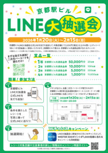 レシート1枚で商品券やWESTERポイントが当たるチャンス。京都駅ビルでのお買い物やお食事をお楽しみいただき、ぜひLINE抽選会にご参加ください。