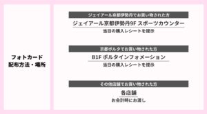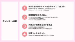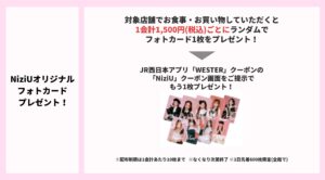 本キャンペーンは、11月6日(木)にNiziUがロームシアター京都でのライブ開催を記念して行うもので、京都駅ビルでのお食事やお買い物でNiziUメンバーのオリジナル・フォトカードがもらえるキャンペーンや、京都限定のオリジナルコラボ商品を販売します。