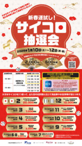 大きなサイコロ2個を振った出目の合計数に応じて、「ホテルグランヴィア京都レストラン食事券2万円分」など、商品券やお食事券が当たる新春恒例の人気イベントです。小さなお子様から大人の方までご参加いただける体験型イベントですので、ぜひ新年の運試しにサイコロ抽選をお楽しみください。
