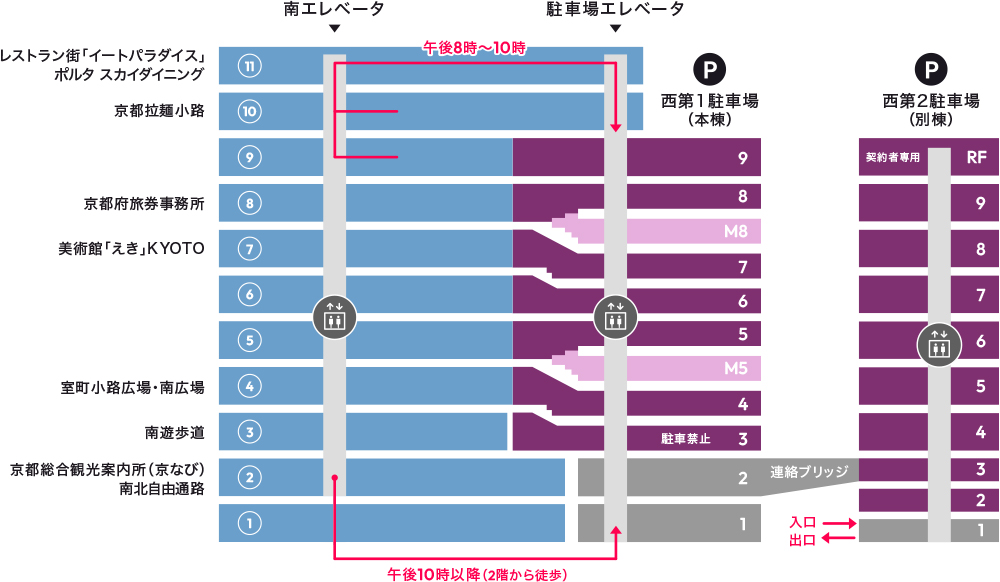 また、各施設にもお入りいただけません。 - 西第2駐車場RF階は、契約者専用となっておりますので、一般車両は駐車できません。